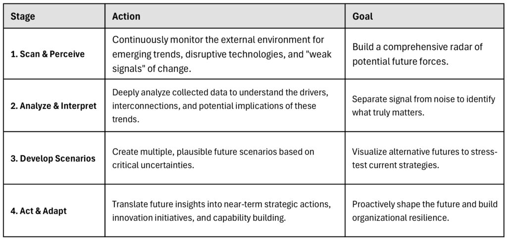 The following chart illustrates a continuous cycle that consulting firms can implement to institutionalize foresight and turn future signals into present-day strategic advantage.